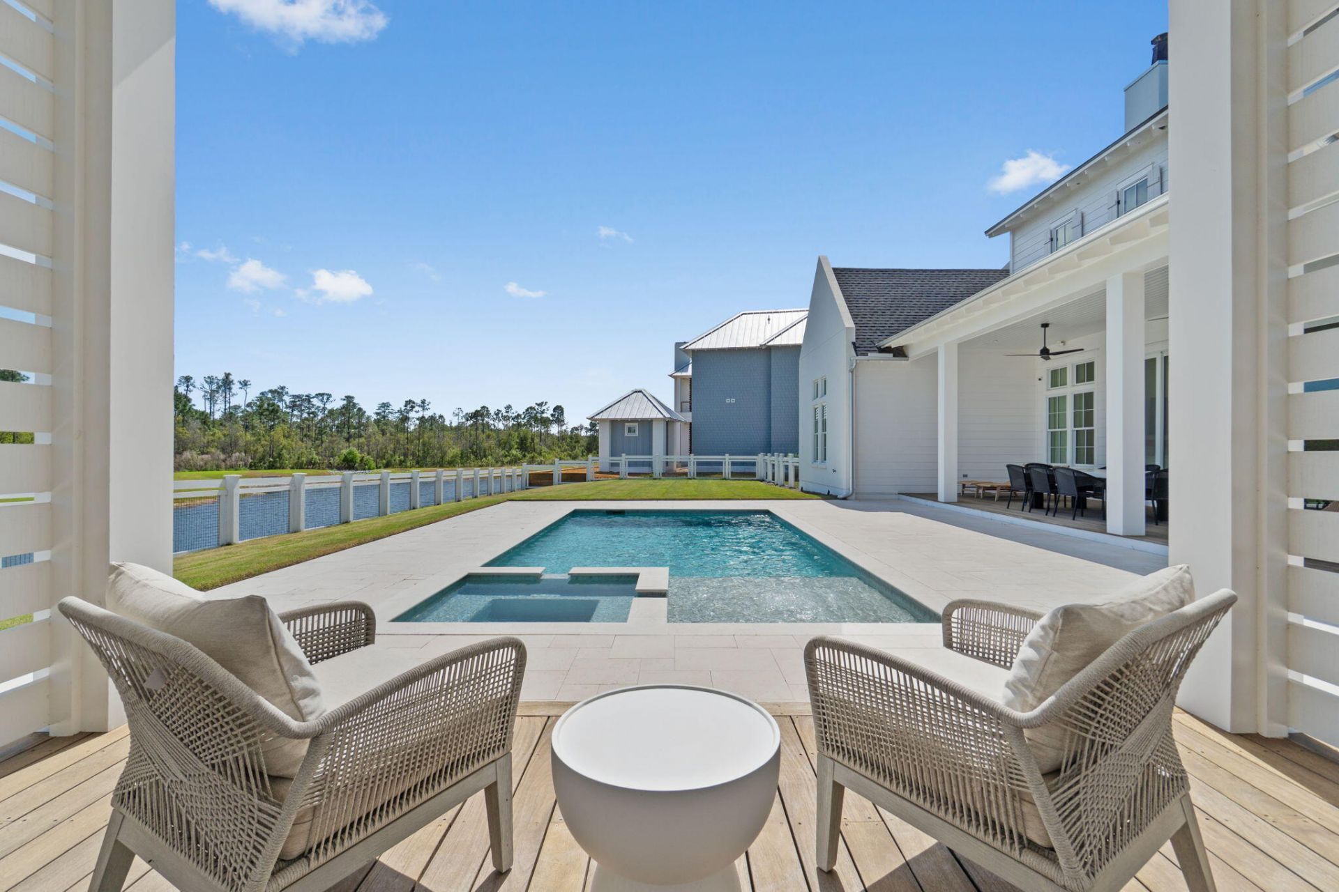 Located in the premier gated community of Watersound Camp Creek, 300 Windsong Drive beautifully captures the essence of coastal elegance in a timeless finish. Superior craftsmanship flows throughout this 5,048 sq. ft., 7 bedroom, 6.5 bathroom home meticulously designed to reflect the refined 30A lifestyle. Impeccably positioned on a pond, the home offers sweeping, unobstructed views of the tranquil surroundings. Upon arrival, the striking curb appeal showcases the upscale slick finish stucco highly favored for its clean aesthetic and polished appearance. Classic exterior design elements are highlighted in the paver driveway, wooden garage...read more